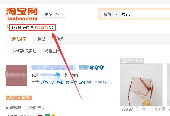 我们来简单对比一下,我们拿女包来举例在淘宝上搜索一下,看到相关的店铺有133万家。