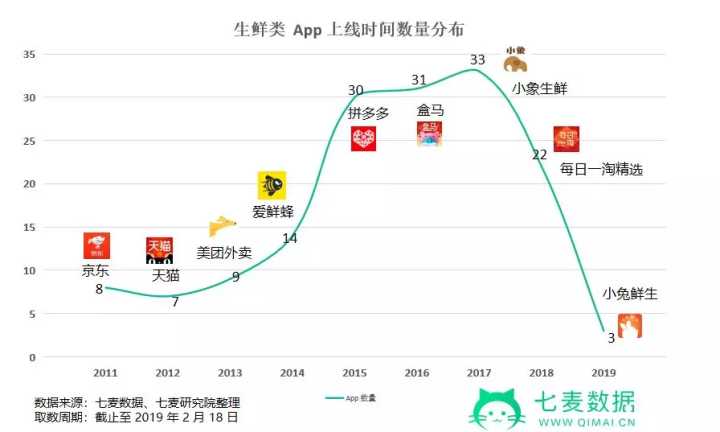 近日,七麦数据选取关键词“生鲜”,用于对中国区 App Store 中的应用程序进行筛选,共选出 157 款生鲜类 App。以 App 在 App Store 上线时间作为分界线,进行数据分析。生鲜类 App 在 2015 年迎来大爆发,此后三年里,平均每年都上线超过 30 款 App。