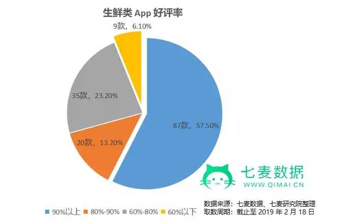 在统计的这 157 款生鲜类 App 中,有 57.5% 产品好评率在 90% 以上,仅有 6.1% 产品好评率低于 60%。整体来看,用户对于生鲜类 App 的满意度较好。