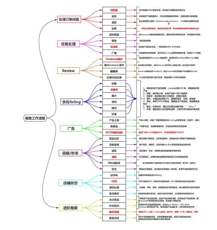 电商日常工作流程包括处理订单问题、在售处理、Review、优化listing、广告、促销/秒杀、店铺状态、进阶推新,在工作过程中不仅要处理好单一问题,还要面面俱到,将所有环节处理好。