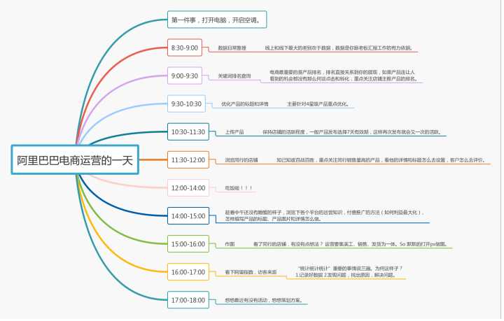 把一天繁杂又棘手的工作通过思维导图的方式,按照时间线或者工作任务去安排,工作效率一定翻倍,保证再也不会出现开会了资料还没准备,下班的路上才想起来优先级A的事情还没办妥的问题,亲测有效。