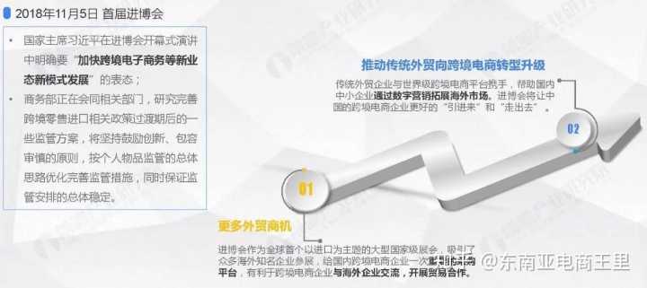 此外,2018年11月举办的首届中国国际进口博览会助推了跨境电商的发展。进博会上,共有172个国家、地区和国际组织参会,3600多家企业参展,超过40万名境内外采购商到会洽谈采购。网易考拉、苏宁易购、京东、阿里巴巴等电商平台均向全球供应商开出超级订单。