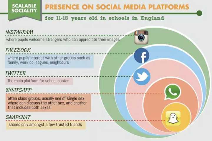 从“可调控社交”的角度来分析英国中小学生,在不同的规模的社交群体使用的APP也是不同的,而中国的社交媒体生态更为集中。