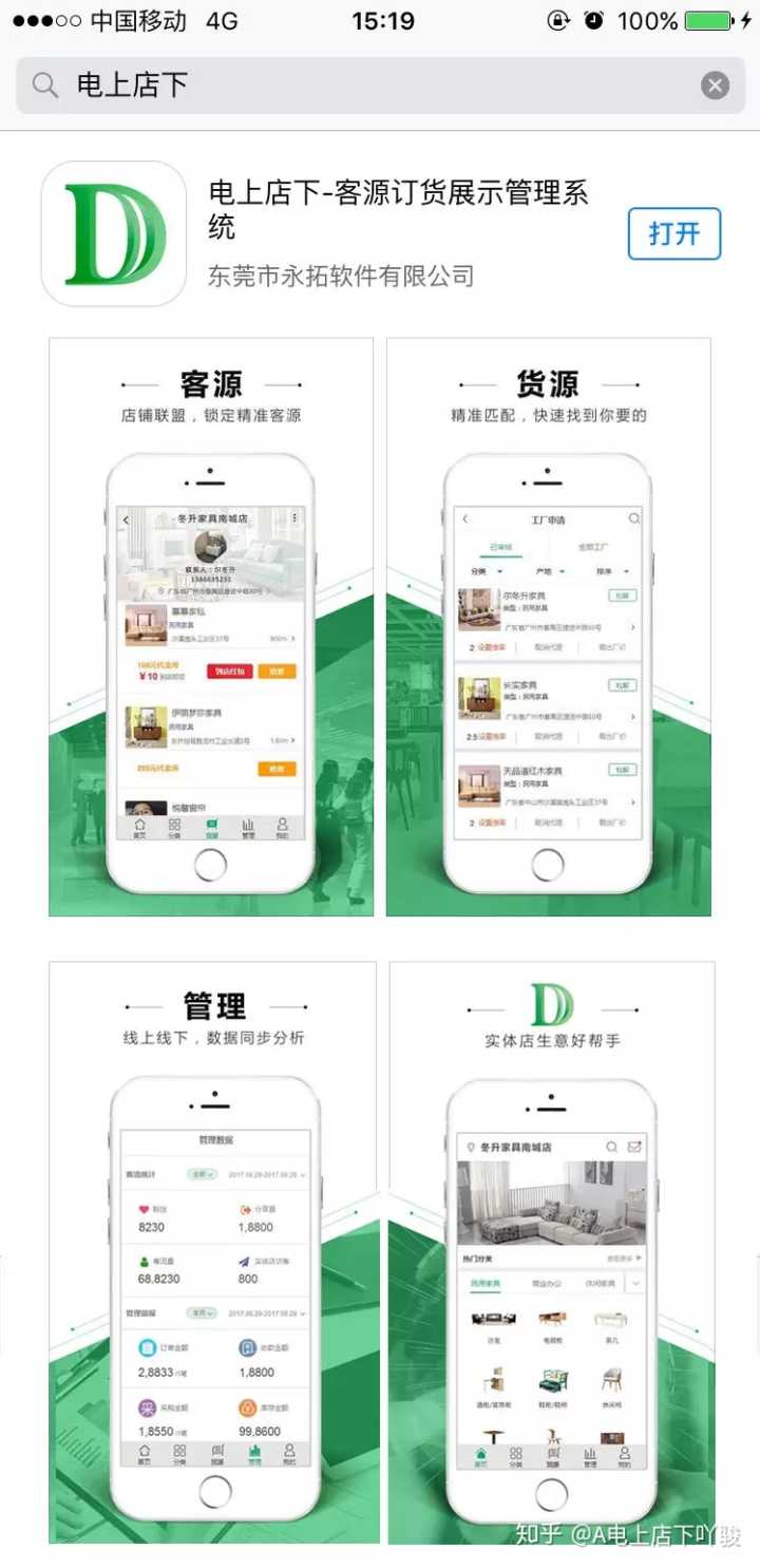 电上店下APP的技术团队,是由服务于家具企业ERP管理系统10年经验的永拓智造家具软件团队领衔开发。2016年,电上店下总结了过去10年服务于家具行业的经验,开发了具有前瞻性的“电上店下”APP系统,从客源、货源、管理三个维度出发,致力成为实体店生意好帮手。