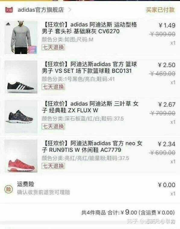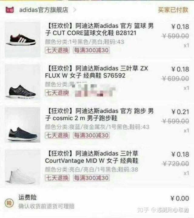 然后呢由于淘宝优惠券算法很复杂,再加上隐藏券,返利,购物津贴等等等,就很容易出现所谓的bug,称之为漏洞单。上面的周黑鸭呀,阿迪达斯呀,都是漏洞单做出来的~