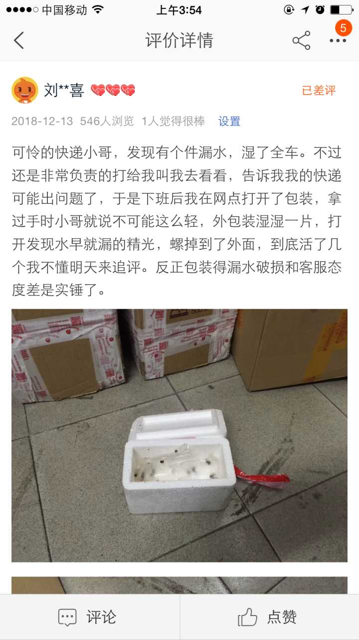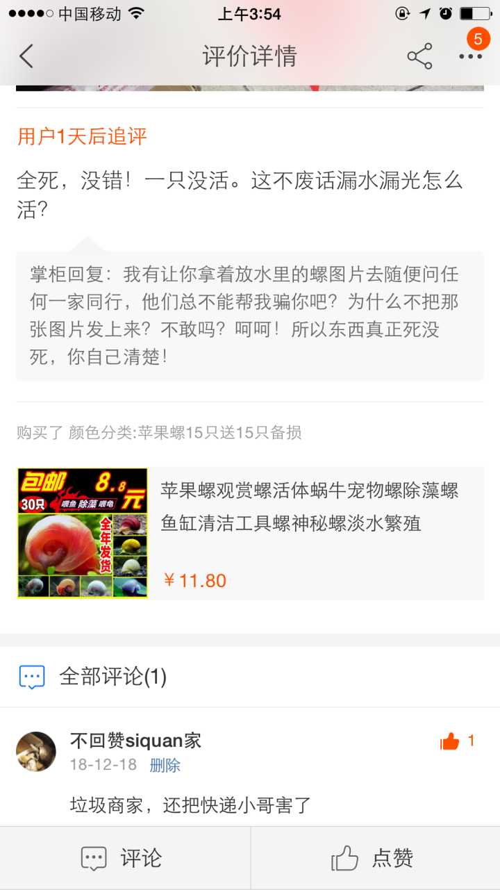 淘宝八块八买了草缸的苹果螺活体。接到快递电话说邮件异常(称重轻了)。打开一看漏干了,螺全死了。找卖家它还不承认,叫我找懂行的人问问。弱智的我真的按它说的加了水等了三小时,确认全死再请求退款,然后卖家以超出时限拒绝了我。哈哈哈!