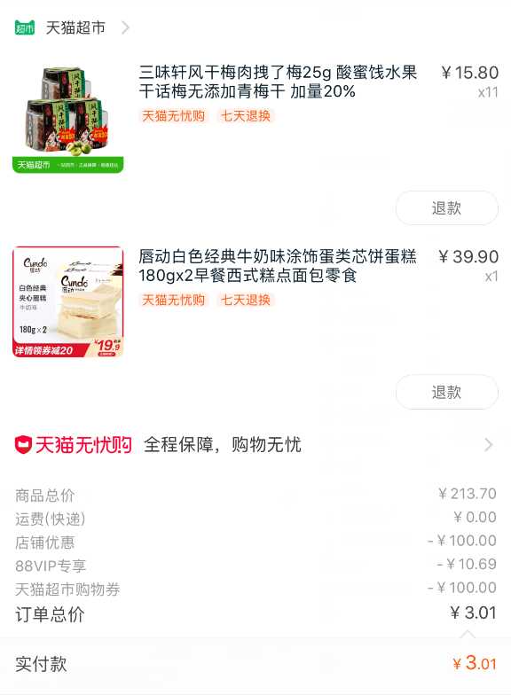 天猫超市的一分钱分布在三个地方