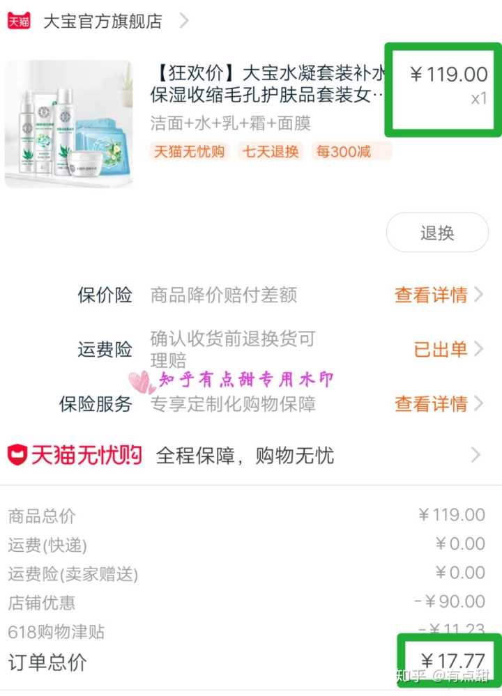 这是今年6月份撸到的,正好赶上了6.18大促,虽然还没开始,但是活动也挺多,叠加津贴和店铺优惠到手17.77一整套,大宝可以说是国货的经典了,我妈妈就一直用大宝的牌子,买到之后送给我的母上大人啦,母上收到之后很高兴,我可真是贴心小棉袄,快夸我