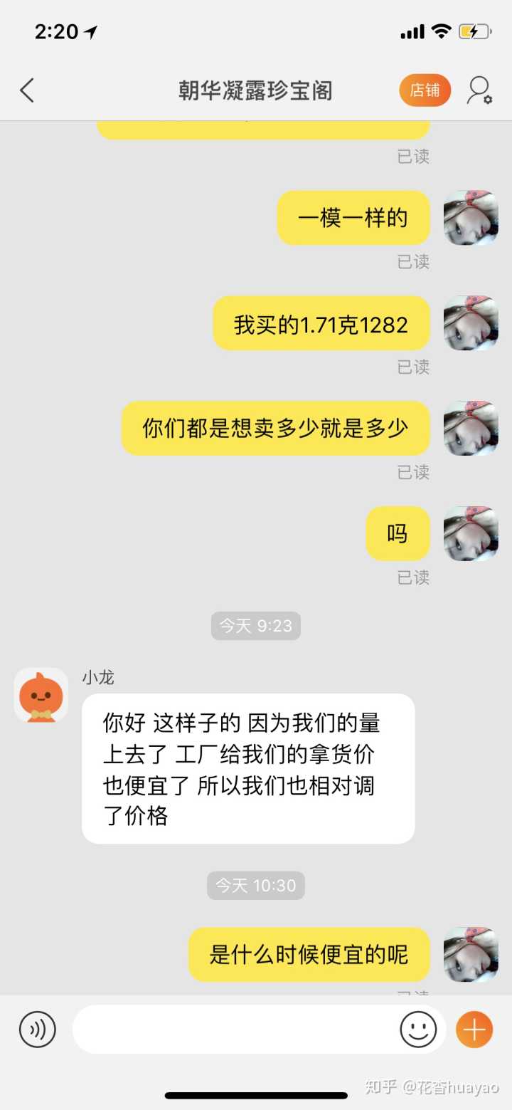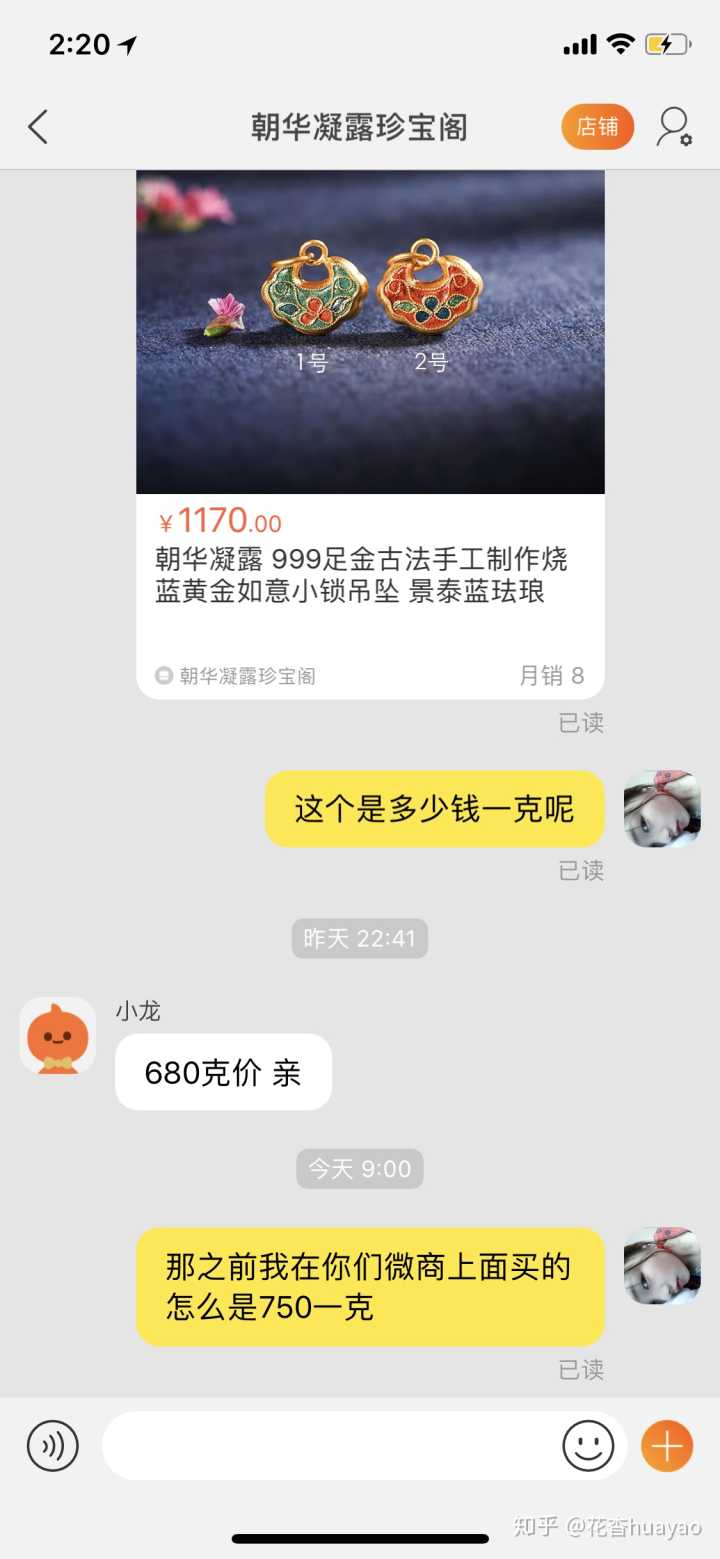 给朋友买了个吊坠当礼物,加了店主的微信,刚开始说750一克,买的1.71克1282,就昨天想去她的淘宝店铺看下,结过一模一样的东西1.72克1170,真的很坑,这100多不算什么,只是很生气,就是那种被欺骗的感觉,说不出的感觉,,,,去询问店家也是不回复了,好8,以后不会在这里买东西了。。。