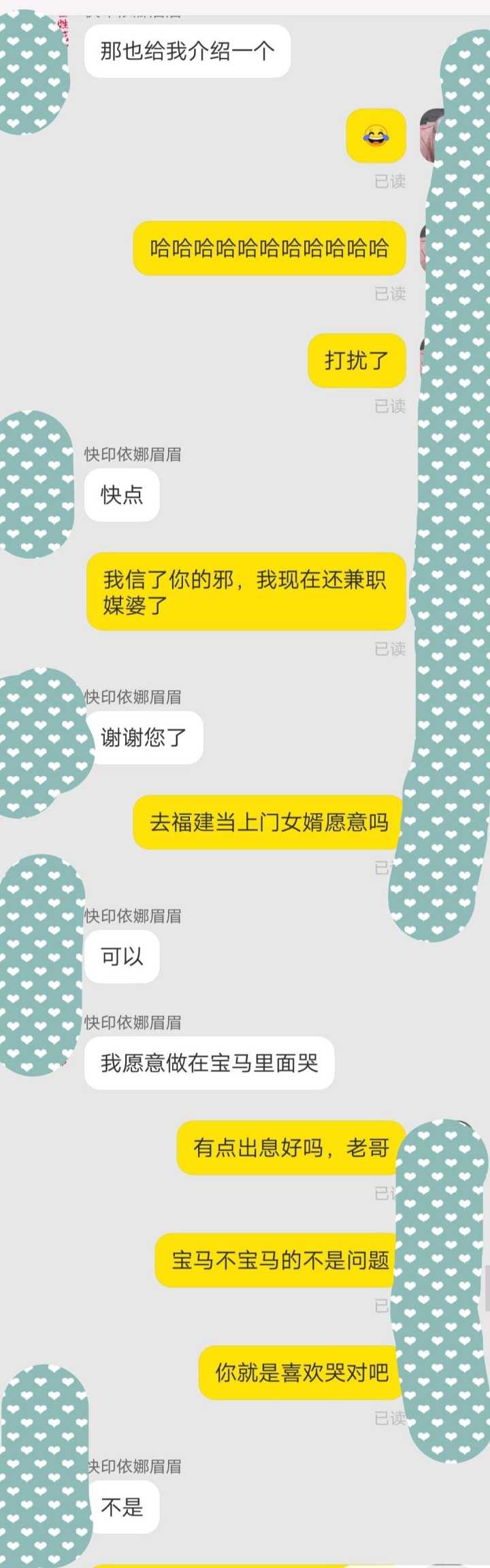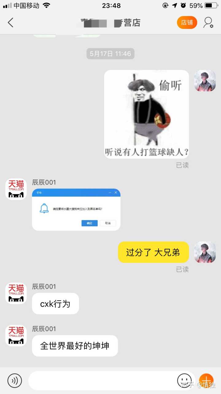说实话我在淘宝上碰到过挺多搞笑的,有让我发表情包给他的(偷走了我好多表情包,哼),还有跟我斗图的,然后上次我买鞋子突然有个客服跟我聊起来让我推荐书。这就算了,最近居然碰到了一个让我介绍对象的exm???现在淘宝开始向百合网发展了吗,噗哈哈哈哈哈哈哈哈哈,笑死我了