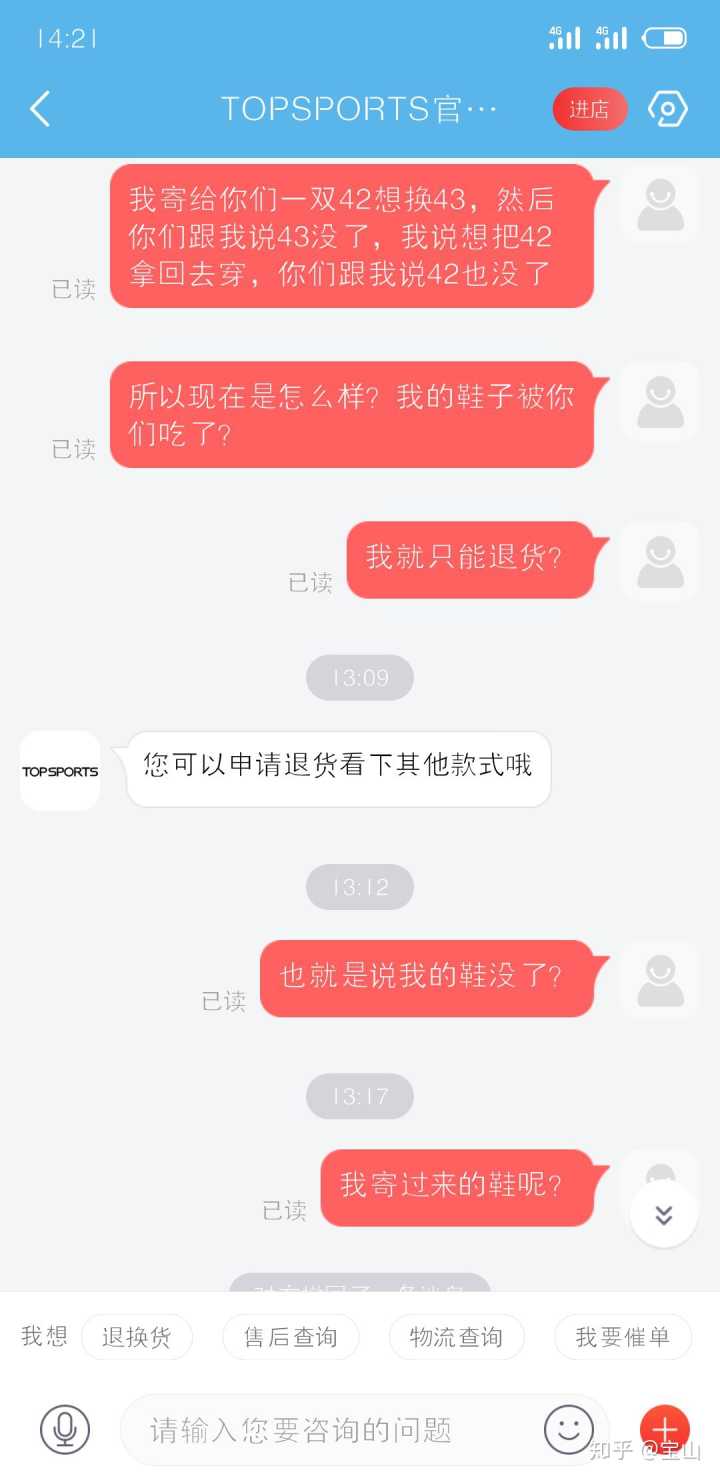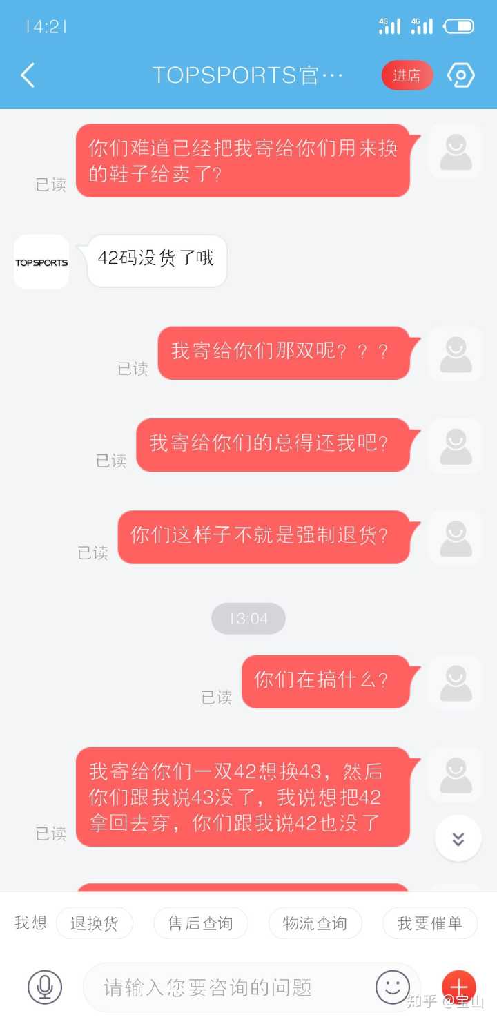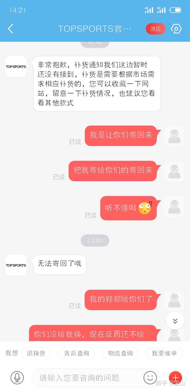 6.1号让人代买了双跑鞋(有券,便宜),6.2就好了,试穿后偏小,当即申请换货,寄过去花了三天,到了之后发给我短信说要换的鞋码没了,让我退货。我百般无奈,只能让他把我寄过去的寄回来,就代表我不换了,当时我让代买的人帮我说了,店家直接答应。然后他们就把我寄过去的鞋子卖了导致我没鞋了???