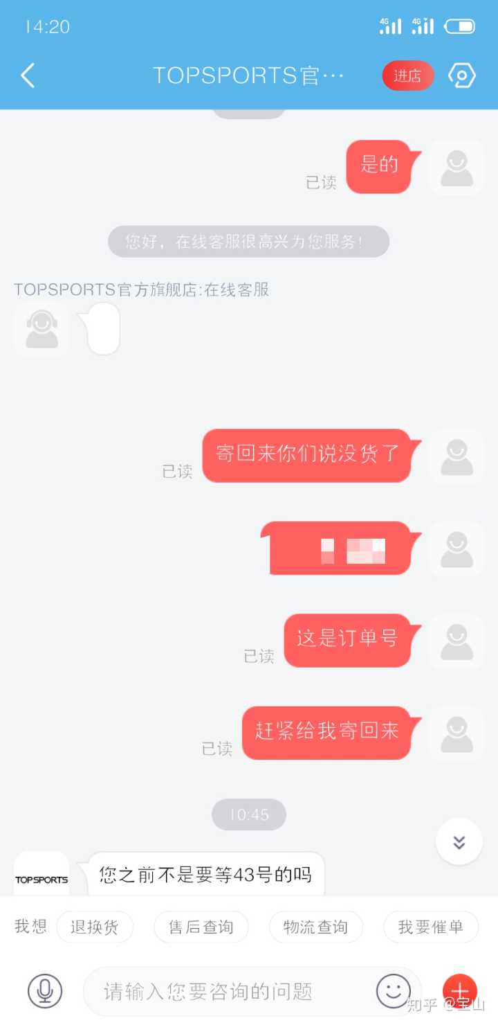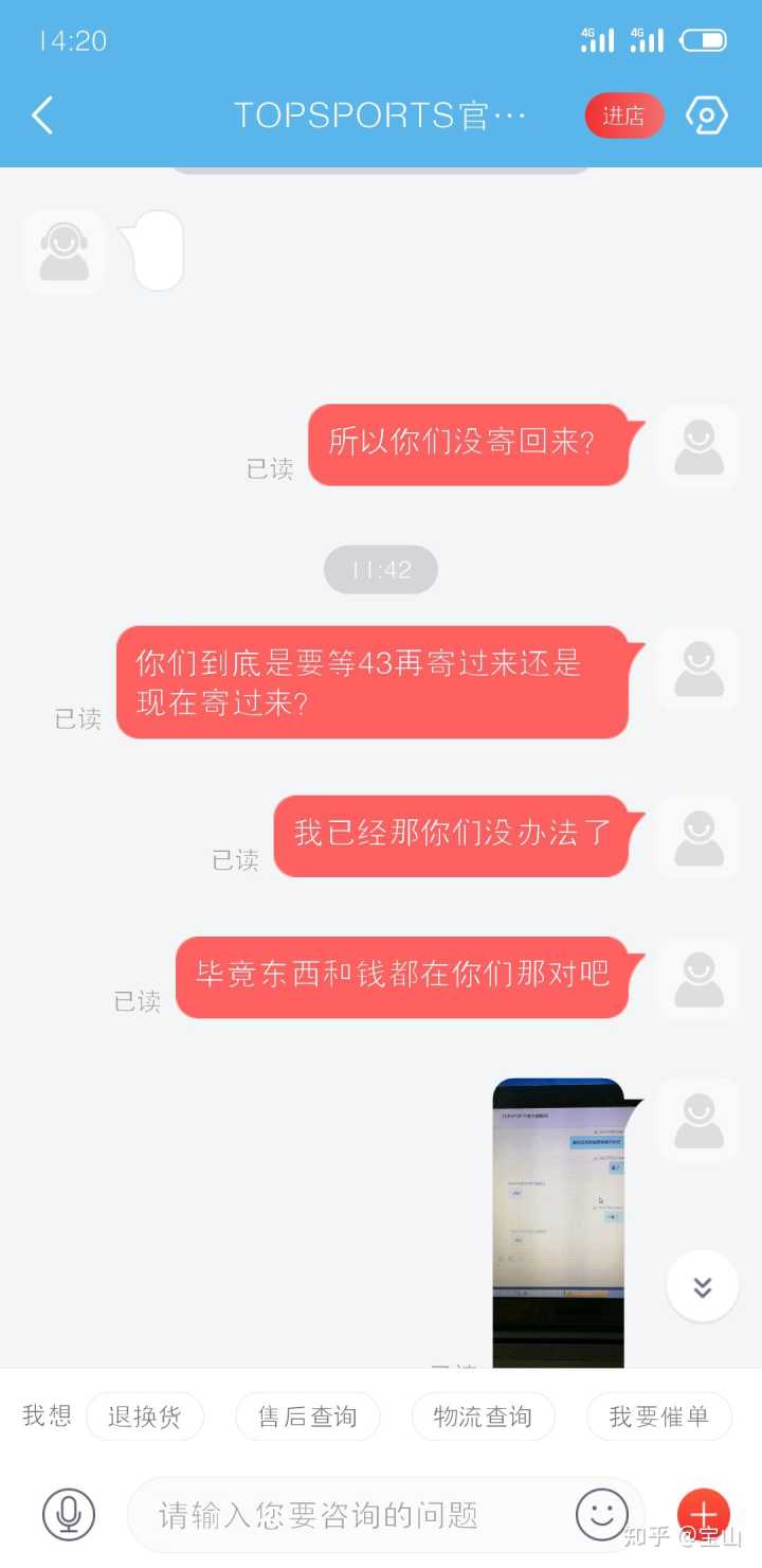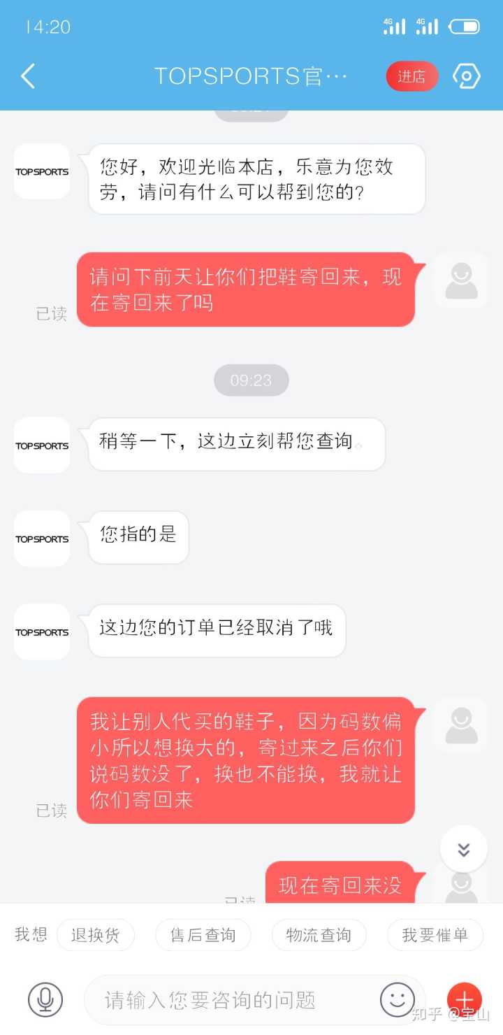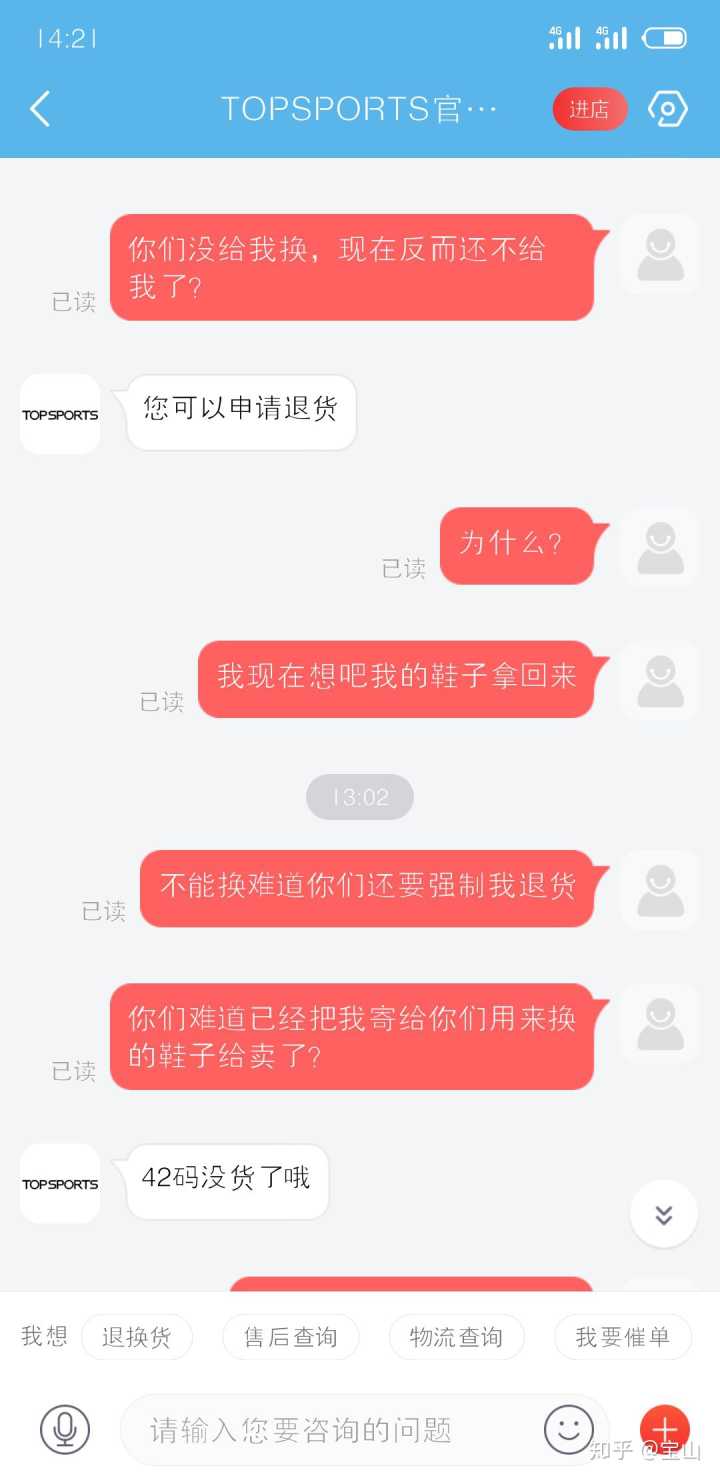 6.1号让人代买了双跑鞋(有券,便宜),6.2就好了,试穿后偏小,当即申请换货,寄过去花了三天,到了之后发给我短信说要换的鞋码没了,让我退货。我百般无奈,只能让他把我寄过去的寄回来,就代表我不换了,当时我让代买的人帮我说了,店家直接答应。然后他们就把我寄过去的鞋子卖了导致我没鞋了???