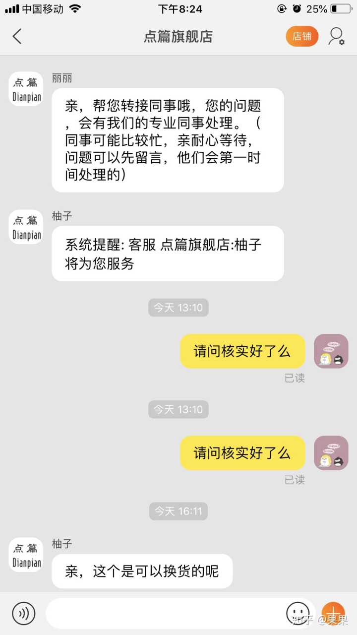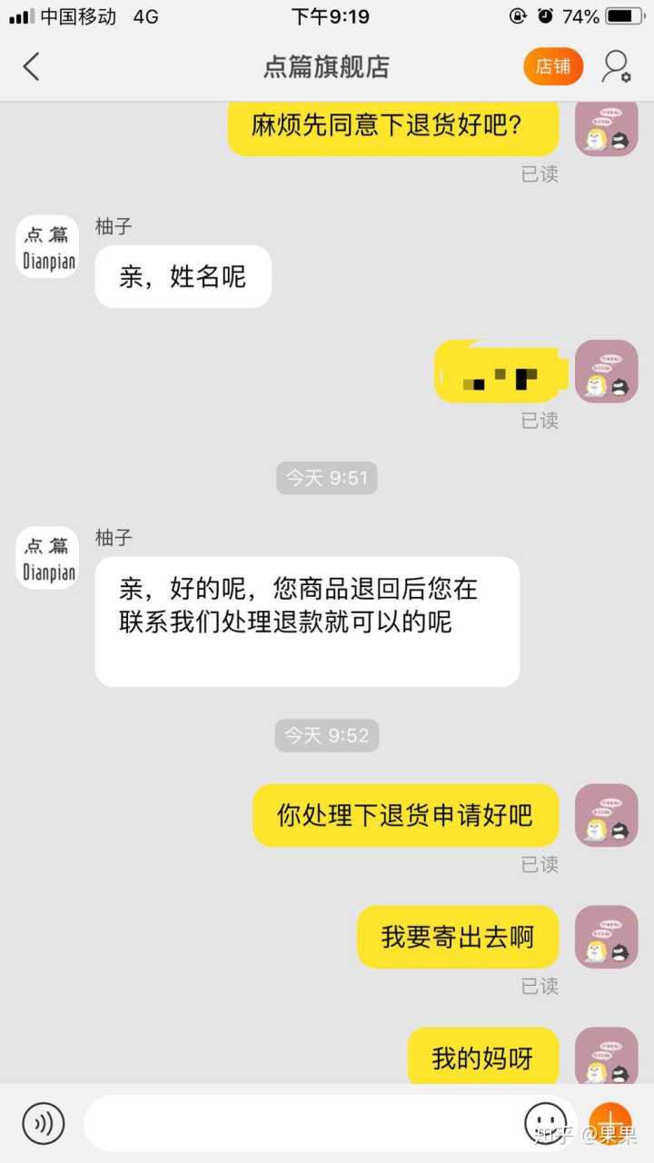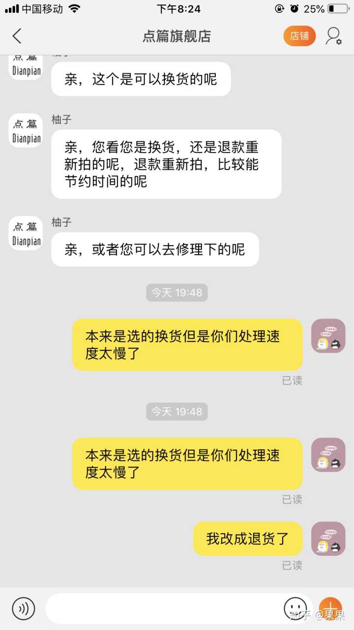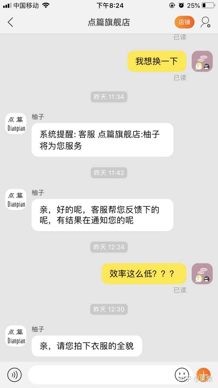 真是羡慕一个不是996的店呢!我愉快的答应了,第二天工作时间我发了好几遍,问有没有看之前的问题,然后又来一遍说反馈售后专员,真是个有条理的店呢!然后售后专员来了,我说我想申请换货,他说要看衣服全貌,然后我又等下班回去再拍,又错过了他5.30下班的时间。。我觉得有点心累,因为我真的是第一次遇到处理效率这么低的店,而我这件衣服的销量只有一件,就是我一个人拍的,也不是什么大忙店。于是我又修改改成了退货。