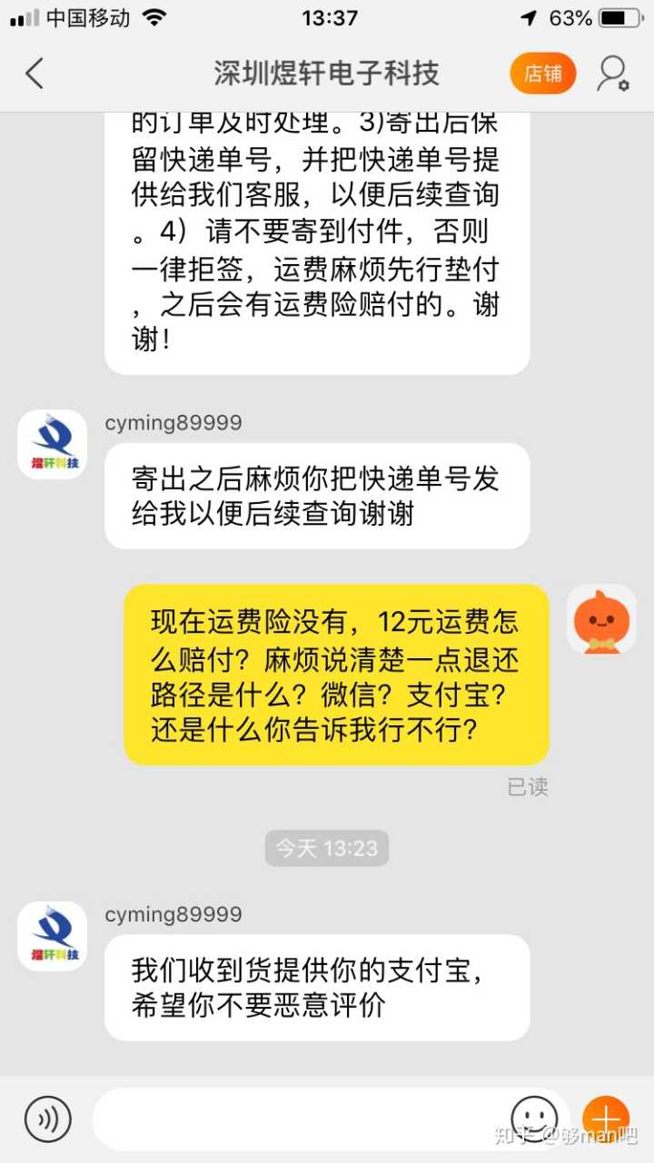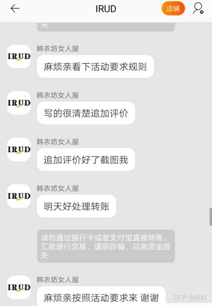 (第一次我提出转账,店家没有看我追不追评,就答应转账。后来没有显示店家转账记录,我再三质疑,店家要求追评“十字以上”。值得注意“十字以上”在TA的规则说明中并没有!!!)