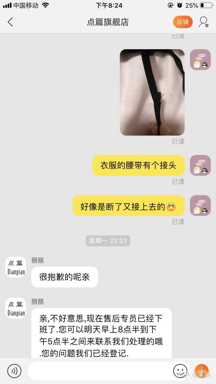 因为店家评分有点低,买之前怕出幺蛾子我自己买了运费险。店家是有7天无理由退货的,果然买回来的衣服是有质量问题,腰带是断后又接上去的。我立刻拍照片反馈客服。客服说:亲,不好意思,现在售后专员已经下班了.您可以明天早上8点半到下午5点半之间来联系我们处理的哦.您的问题我们已经登记.