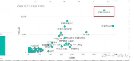 那么这个就是最终的图表。现在我简单分析一下怎么使用的问题。我们现在的问题是,想知道哪些关键词在过去一段时间里头,比较有用。说白了,就是访客数比较高,转化率也不错那样子。当然,如果你的要求比较高,要多看几个指标也随你。