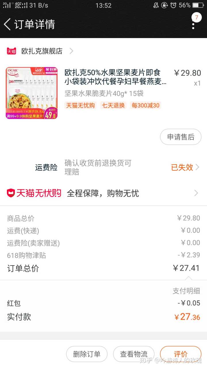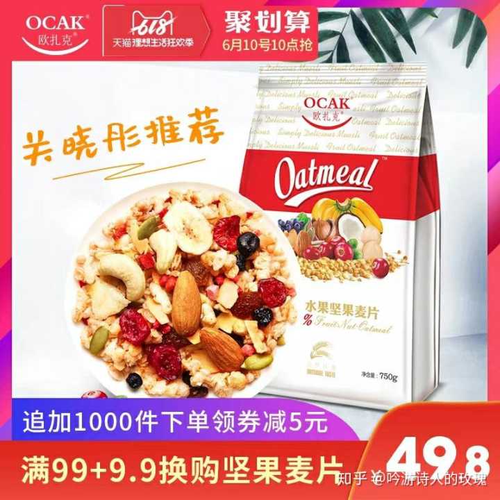 下一个网购零食是欧扎克麦片,是去年我去别的宿舍吃到的,当时的感受就是这个麦片用料很足,里面有各种坚果,果干,味道很喜欢,如图