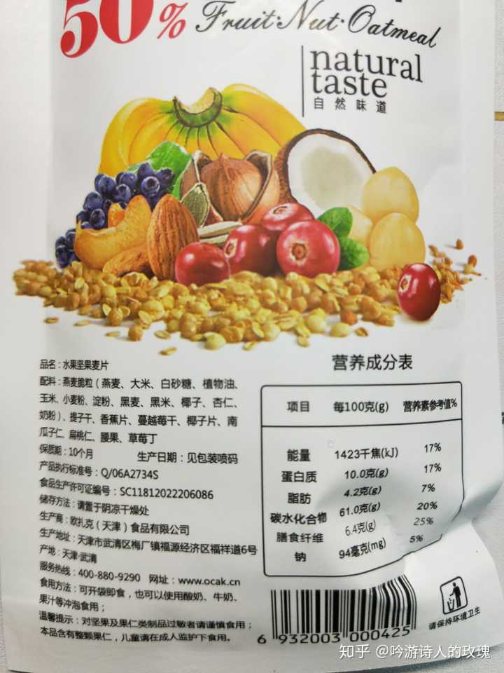 总的来说,这个麦片算是非常优秀啦,坚果果干含量是50%,减肥的小仙女们可以选择绿色包装的麦片,不是即食的,要自己煮,自己煮的话热量不高的,如果不方便煮的话,就买小包装的,早上吃一袋,热量不高。不减肥的小仙女们随便买哪种啦,现在还有一个紫色包装的,里面新添加了酸奶块。