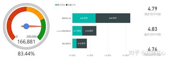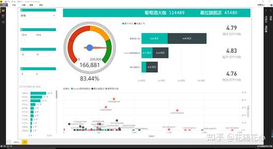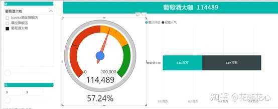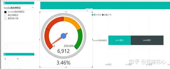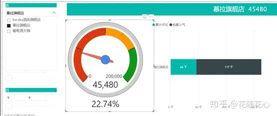 左边的码表,我自己叫做三色表,红色代表一般,黄色代表不错,绿色代表非常棒。什么意思呢?其实上面的数据,我用的也是最近30天的成交件数,通过切片器,可以快速知道不同店铺,各自的销量,距离自己设定的目标值有多少。