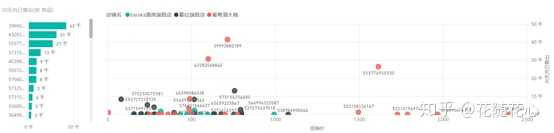最下面的这个图,左边就是分析单品的销量,快速知道哪些单品的销量最好,以及旁边的散点图,通过分类的方法,让不同的单品归属于不同的店铺一目了然。