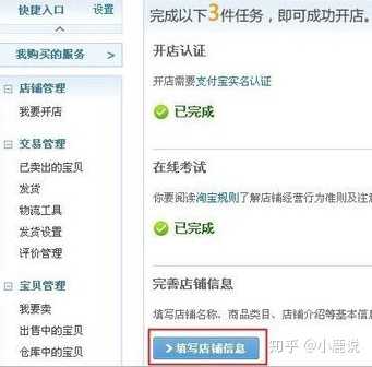 如果您进入“卖家中心”页面点击“我要开店”或“免费开店”,开店认证显示“已完成”,那么继续完成“在线考试”和“完善店铺信息”便可以拥有自己的店铺了,在左侧菜单栏“店铺管理”处即可看到“查看我的店铺”字样。