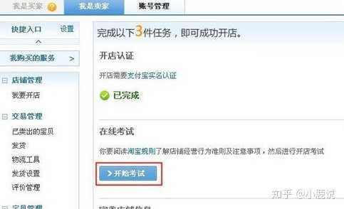 您进入“卖家中心”,点击“我要开店” 或“免费开店”进入开店任务页面,点击“开始考试”即可开始开店在线考试,