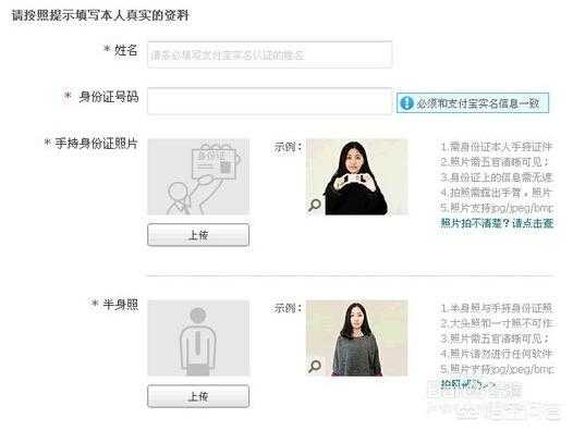 4、进入下一步后会看到如下图这样的页面,请务必严格按照淘宝的认证规则填写上传姓名、身份证号、手持身份证的照片、半身照。