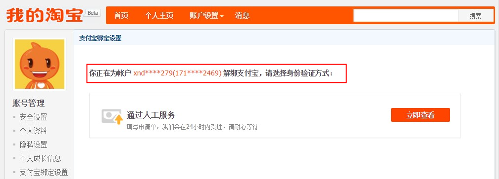 绑定或者换绑支付宝,验证方式只有人工审核,或者手机不可用,怎么办? 大文 四月 4, 2016 商品管理 0 条评论 2190 围观 亲,如果您在绑定或换绑支付宝时,遇到如下验证方式: 1、验证方式只有人工审核:一般是系统自动检测您账户目前的状态后提供的验证方式,您可以联系在线客服帮助您解决问题哦~ 2、验证方式是手机验证,但是手机不可用:请联系在线客服帮助您解决问题哦~