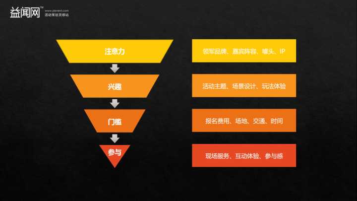 一个活动的策划要符合“注意力-兴趣-门槛-参与”原则。从吸睛的卖点(注意力)、到有趣的活动形式(兴趣)、友好的参与方式(门槛),最后是参与时的现场体验(参与),每个环节都要照料到。