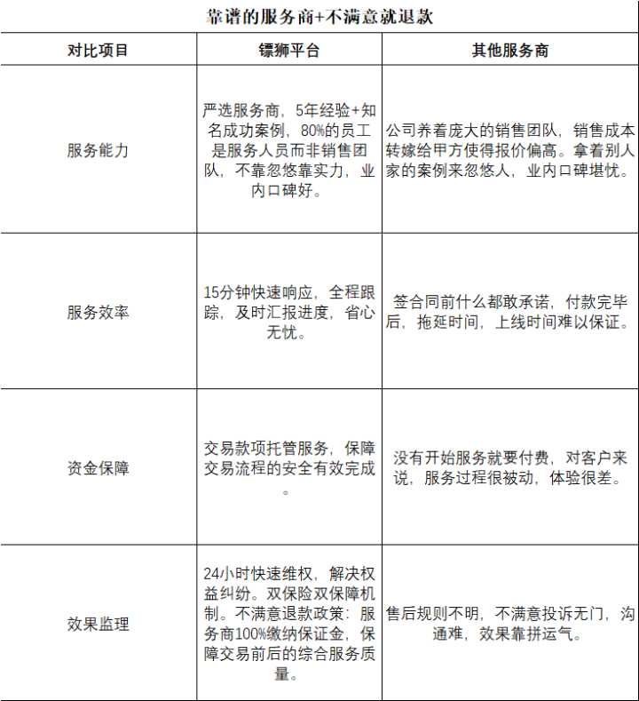 所有交易款项交由镖狮托管,你对营销效果满意确认后再付款给服务商,以保障交易的安全和营销效果的达成。对效果不满意,可退款。