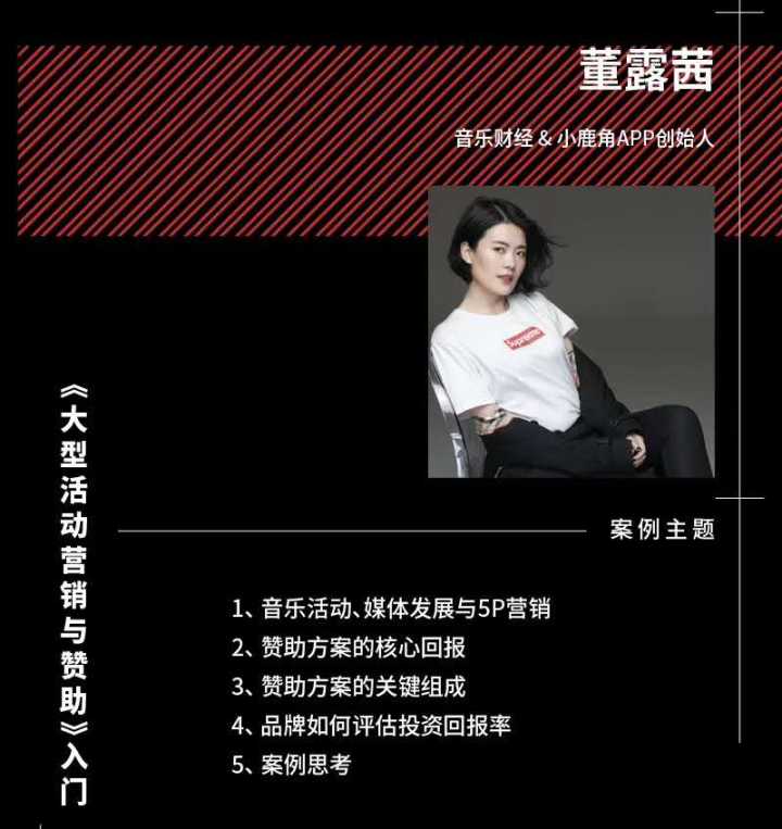 音乐财经本周六6.22日将举办“小鹿角学院-产业未来领袖计划”线下案例剖析课,我们邀请到了奔跑怪物CEO高航、酷我音乐《榜样阅读》制片人郭俊堃、咪咕音乐演艺事业部高级运营顾问周余,来为我们从案例战术分析、传播方法、资源整合、以及消费者与品牌/IP的连接度等维度进行剖析,让行业新人更好的了解如何制造话题量,如何吸引海量受众主动关注参与;以及音乐项目如何获得品牌赞助,品牌又会如何衡量赞助活动的投资回报率。想知道这些问题的答案,就在本周六来跟我们相会吧!