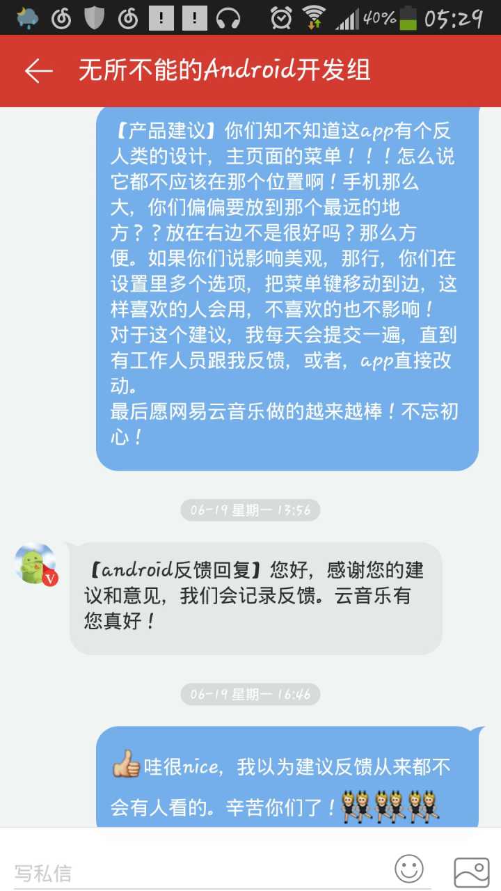 因为手机太大,网易云设置键又在左上角,每次点都挺麻烦的,所以我去反馈建议了!!!你们知道,这些反馈建议什么的在别的地方就如石沉大海,得到回复的可能性太小了。