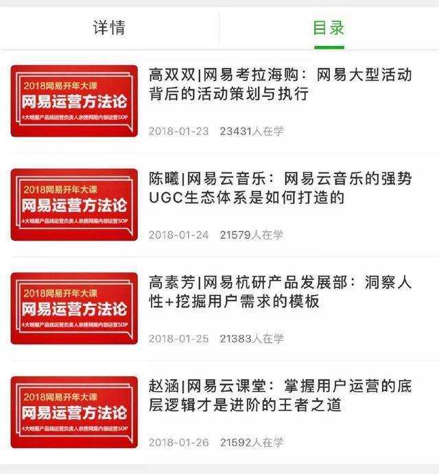 从昨天晚上到今天,不少人的朋友圈都被(上图)这红彤彤的一片网易海报给占领了。根据网友的推算,网易应该是昨晚8点左右推出的该课程。这是一款教人运营的课程,由网易考拉、云音乐、云课堂和网易行研产品发展部的四位产品运营负责人传授运营经验和技巧。文案上有“2018网易开年大课:4大明星产品运营负责人亲授网易内部运营SOP”的字样。