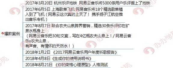 从2017年3月到2018年8月,网易云音乐一共策划了六起爆款营销活动,办办学苑按时间整理如下: