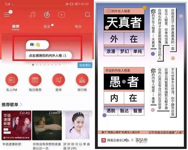 2018 年 8 月,网易云又在自家轮播上搞事情,测试用户的内外人格,学术上称为“荣格心理测试”。