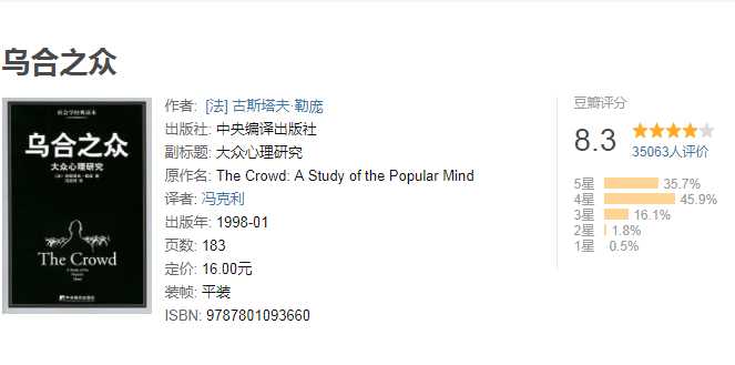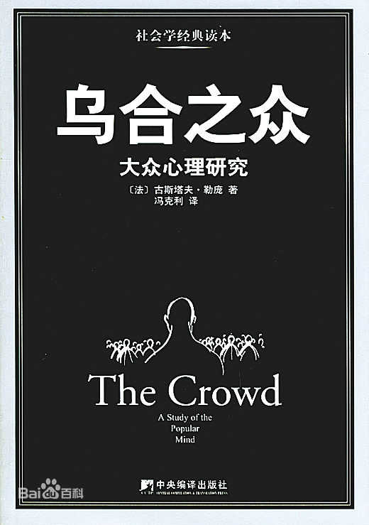 《乌合之众:大众心理研究》为社会心理学领域的经典著作,作者以十分简约的方式,考察了群体的特殊心理与思维方式,尤其对个人与群体的迥异心理进行了精辟分析。(想学营销读心理,我只服这一本书,看完这本书,你不用再怎么去看其他心理学书籍了)