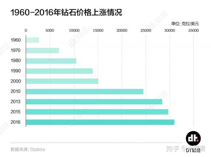 钻石的身价也一路上涨,以美元计算,从1960年到2016年,钻石价格涨幅超过11倍。以美国劳工统计局消费者物价指数为计算依据,美国在这些年间的累计通胀率约为711%——钻石的价格涨幅远远跑在通胀前面。