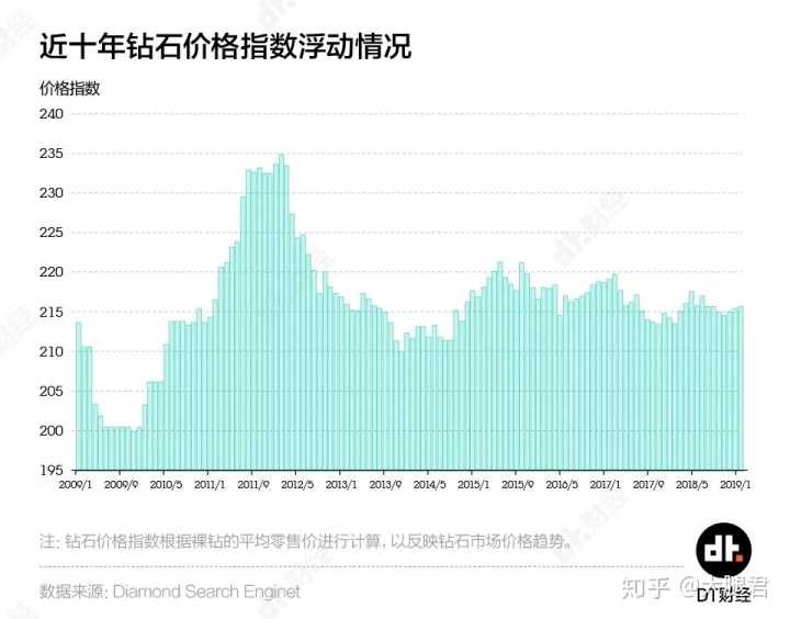 钻石价格趋势近几年显得十分低调。2012年钻石零售价的价格指数达到234的高峰,随后就一路大幅下滑。2014年,在需求疲软和资金流动性枯竭的情况下,钻石成品商纷纷下调价格,钻石价格因此在当年下降了8.7%。2017年以来,钻石价格指数基本徘徊在215左右。