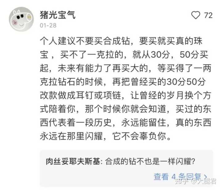 在精致女孩的聚集地——小红书上,关于人工钻石的笔记已有1397篇。不过,更多的内容是对人工钻石的科普介绍,真正购买的人少之又少。其中一条科普笔记下的高赞评论引起了DT君的注意。这位ID名为“猪光宝气”的猪猪女孩用钻石标榜自己的人生价值,她认为便宜的合成钻石留不住洗尽铅华的岁月。