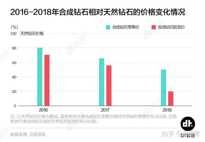 中国公司每年会生产约百亿克拉用于工业领域的钻石,但进入珠宝行业的人工钻石每年仅有几百万克拉。也许是因为工业钻石的利润并不高,中国公司们卯足劲提高技术,希望将触手伸向珠宝钻的地盘。效果也很惊人,根据贝恩咨询的数据,近两年,人工钻石的零售价和批发价都在快速下降。到2018年,人工合成钻石的零售价仅为天然钻石的一半,而批发价更是低至天然钻石的20%。
