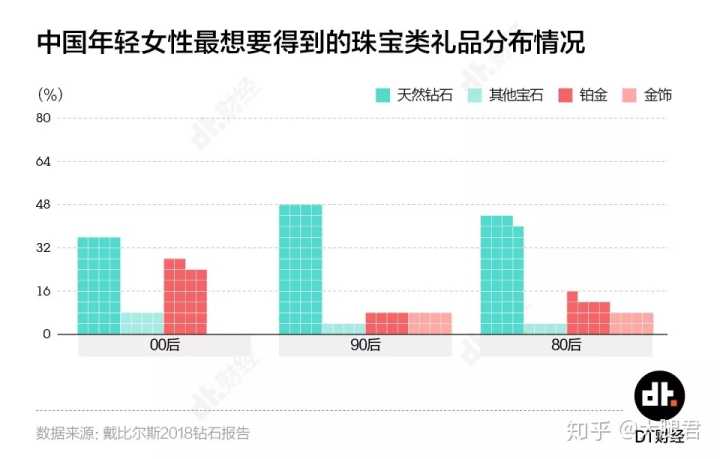 根据戴比尔斯2018年发布的钻石报告,中国年轻女性最想要的珠宝类礼物仍然是天然钻石。不过,在00后的礼品清单中,其他宝石这个选项相对高出许多。