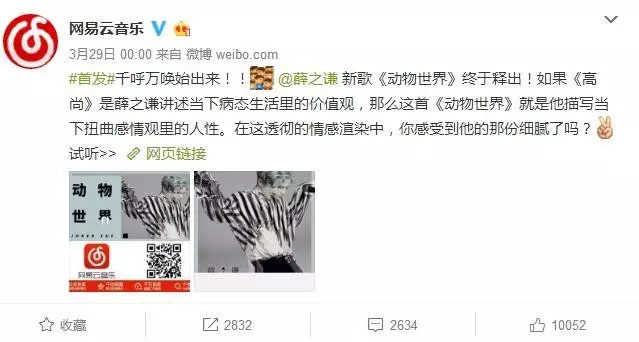 日常宣传主要围绕“音乐首发”“歌曲推荐”“歌单”推荐等话题展开。比如,薛之谦新歌《高尚》发布的时候,网易云音乐也对此进行了宣传,单条微博被转发2836次。