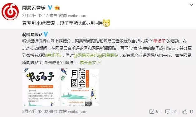 网易云音乐曾和@网易跟贴联合发起“串场子”的活动:用户写下与“春”有关的段子或打油诗,并分享到微博+话题#串场子#,同时@网易云音乐@网易跟贴,就有机会获得网易猪肉一斤。