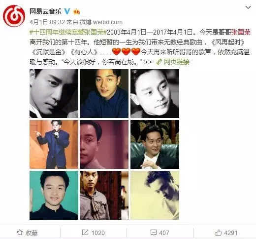 网易云音乐在几乎每一个重要事件节点,都会发布令人感动的微博文章。例如4月1日的时候,发布几年张国荣的文章#十四周年继续宠爱张国荣#、在明星生日的时候会发文祝贺并带上感人的文字等等。