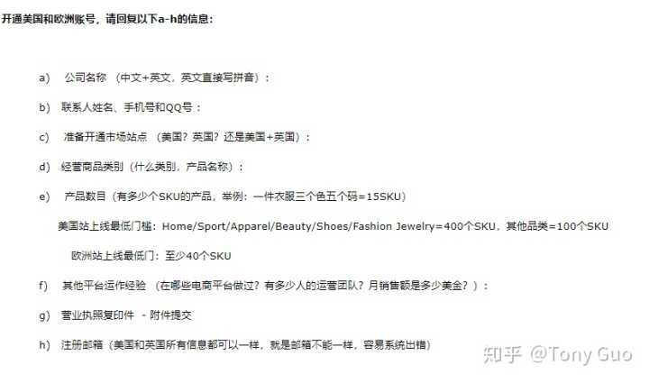 接下来讲一下招商经理邀请注册(推荐优先招商):通常我们都是建议优先通过招商经理的邀链接注册,这需要你有对应站点招商经理的邮箱,首先联系招商经理说你要全球开店,开什么站点,然后他会回复给你一封邮件里面有资料登记的表格,你按说明填写,反馈给他,他审核觉得你的公司ok就给你发邀请注册链接,表格尽量不要填错,经理很忙,不会跟你频繁的邮件往来,建议一次性填写完成方便经理快速发链接给你。