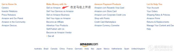 打开美国亚马逊的主页,在页面最下方点击“Sell on Amazon”;