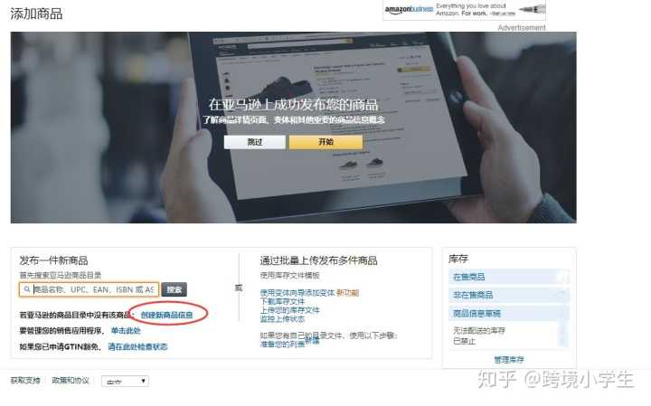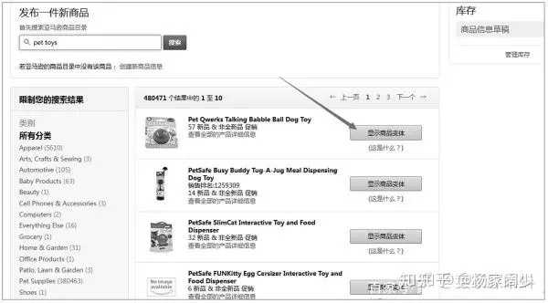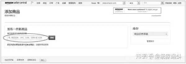 找到库存模块,点击添加商品按钮,来发布一个新产品,你可以看到一个搜索框,让你输入商品名称,asin码,upc等,就会跳出相关的产品出来。