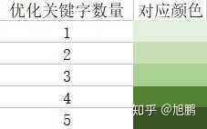 颜色越深代表效果越好,其颜色由深到浅分别为深绿→浅绿,对于C方法优化的关键字而言,同样采用深色到浅色的渐变,深绿为优化了5个词,浅绿为优化了1个词,并设置如下对应表格,如下图3,图4所示: