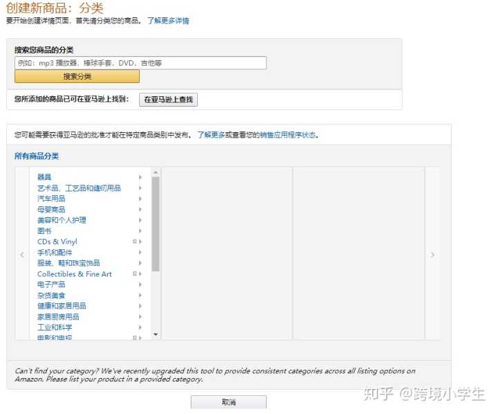 首先要把我们产品想要放入的类目选取出来,可以搜出自己的细分类目,也可以通过导航一步步找到自己的细分类目,一般可以参考行业大卖所在的类目来归置我们自己的类目,类目一定要选精细,因为亚马逊对关键字的类目屏蔽是很严格的,这里需要注释类目屏蔽,以后再讲到。