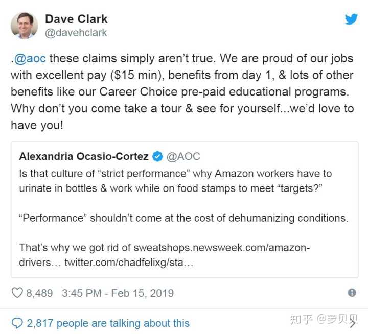 AOC不断妖魔化亚马逊是残酷剥削工人的血汗工厂,这引起了亚马逊副主席的直接呛声反击,邀请AOC来亲自去亚马逊参观看看工人是不是极其悲惨地每天工作。